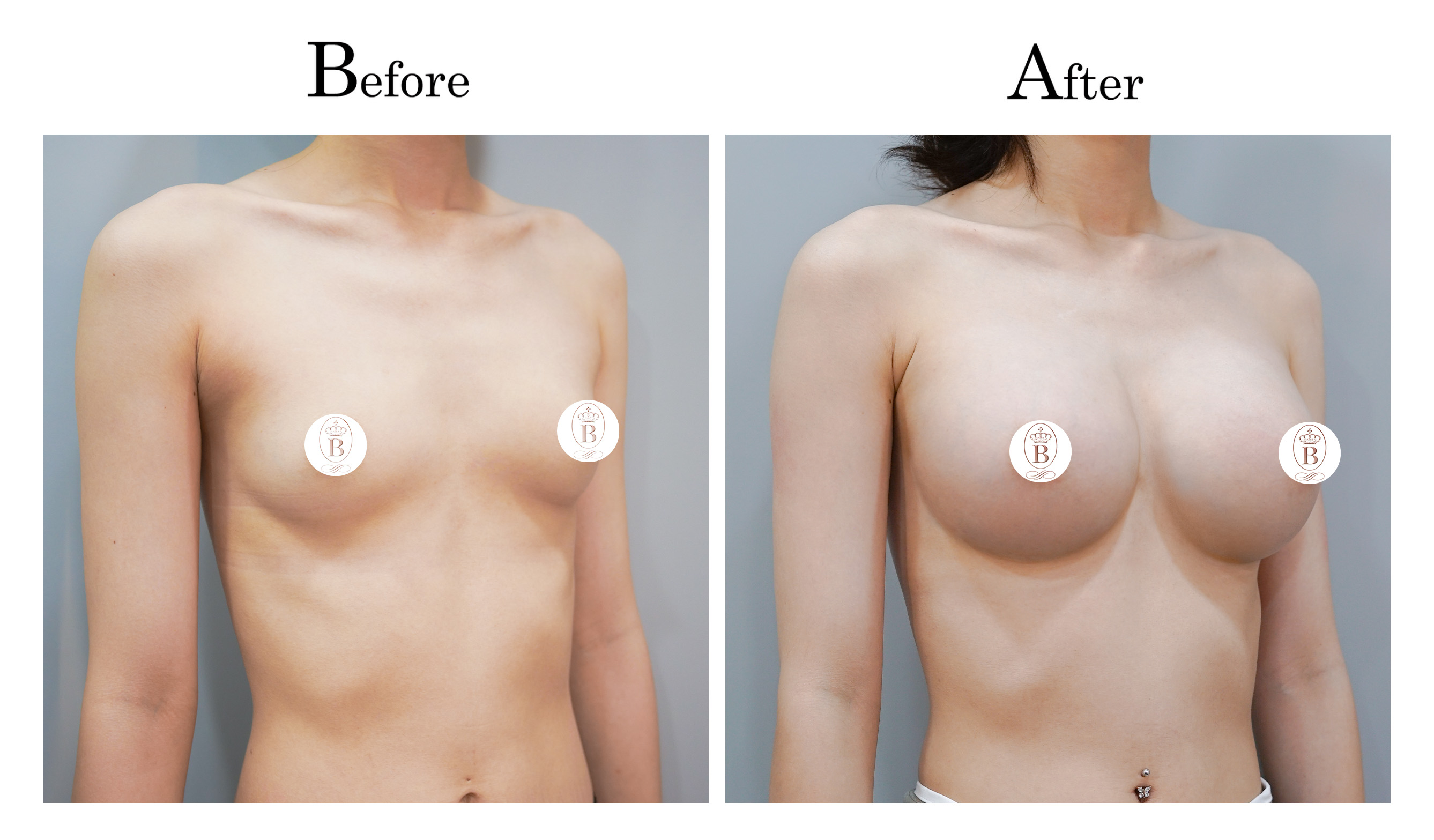此案例本身條件屬於A罩杯,病患一直夢想希望到E罩杯,但又不希望感覺太OVER,另外也不想要術後一直按摩,因此選擇屬於比較自然術後也不需按摩的水滴型果凍矽膠隆乳,此次手術從腋下植入,因此從外觀看不到傷口,腋下的切口癒合後藏在皺褶中,也不容易看出。